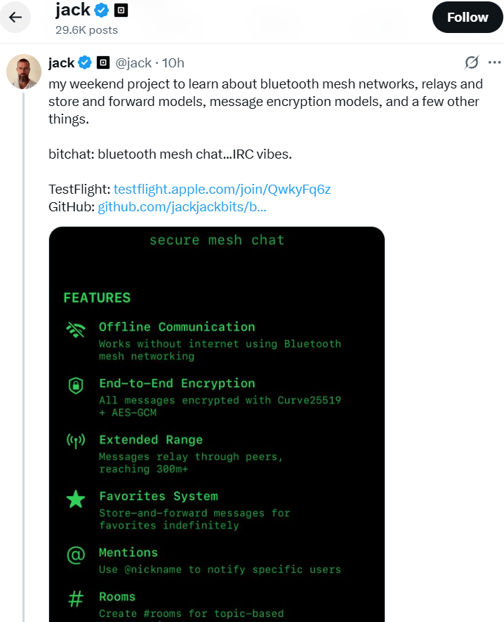 In real-world terms, this means that as long as someone in the chain is within Bluetooth range, your message can eventually be passed down the line—even if the recipient is several hops away. This concept isn’t entirely new (similar ideas power apps like Bridgefy and Briar), but Dorsey’s implementation takes things further with modern cryptographic standards and a developer-first approach.
